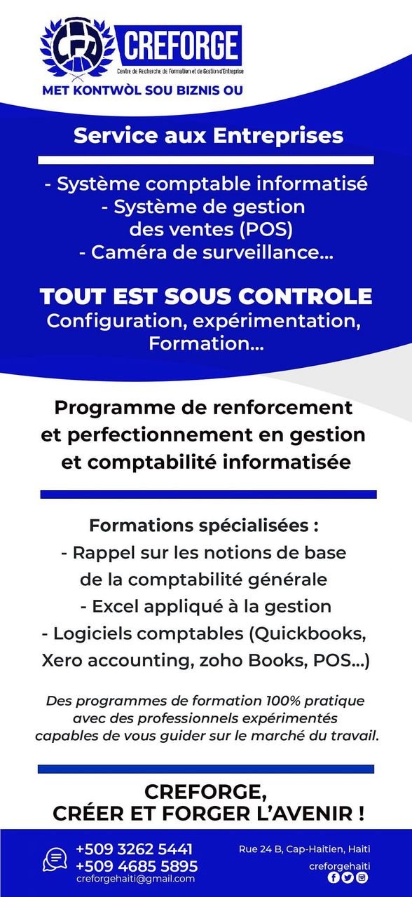 En plus de la formation continue qui constitue l’une des activités essentiels de son existence, le CREFORGE propose aux propriétaires d'entreprises un service dénommé : "MET KONTWOL SOU BIZNIS OU".